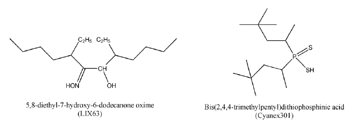 Cyanex 272 (Cytec Ind., 85%), Cyanex 301 (Cytec Ind., 70%), Versatic acid 10 (Cytec