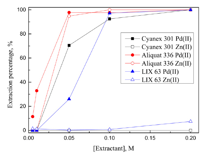 용매추출실험을 통해 팔라듐(II)과 아연(II)의 분리에 효과적인 추출제를 선정하기 위해 합성용액을 제조해 실험했다. 합성용액에서 팔라듐(II)과