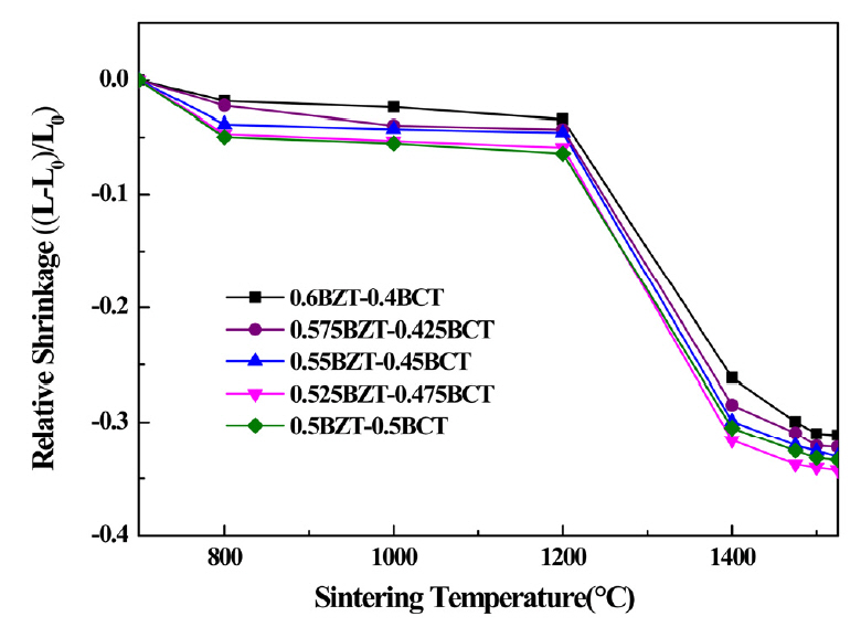 Figure 1 shows the relative shrinkage ratio of the (1-x) BZT–xBCT ceramics sintered at temperatures