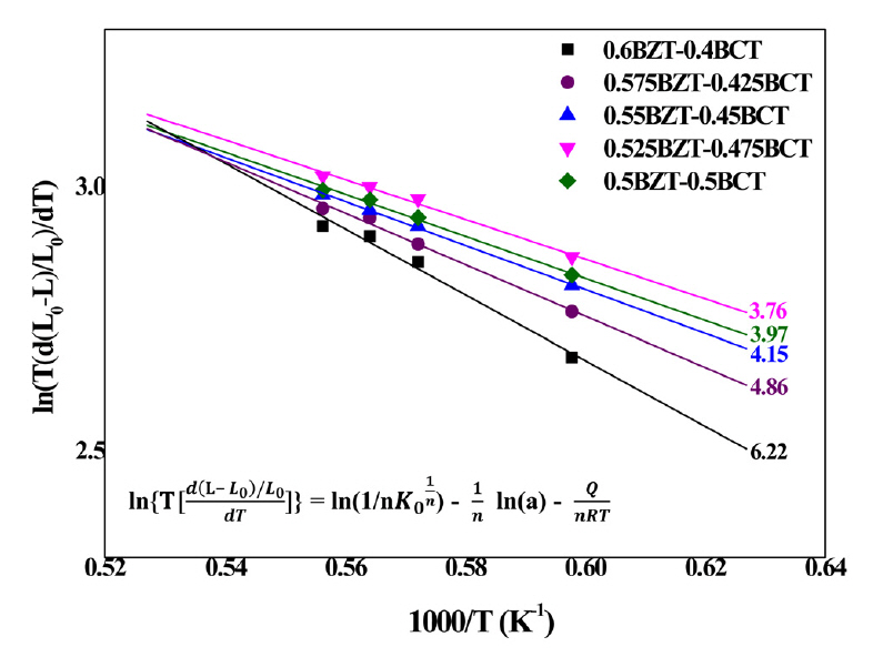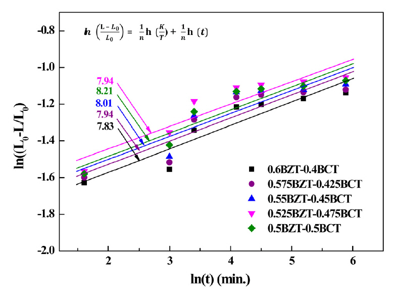 was adopted to derive activation energy from shrinking behavior. (1-x)Ba(Zr0.2Ti0.8)O3-x(Ba0.7Ca0.3)TiO3 has been intensively investigated for application in sensors and energy harvester