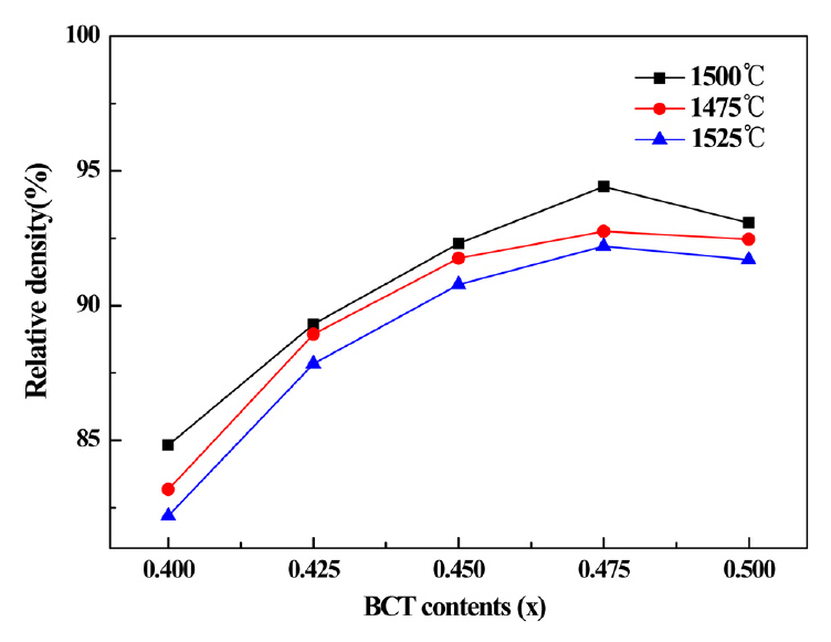 Figure 6 shows the relative densities of the (1-x)BZT–xBCT samples sintered at 1475 °C, 1500