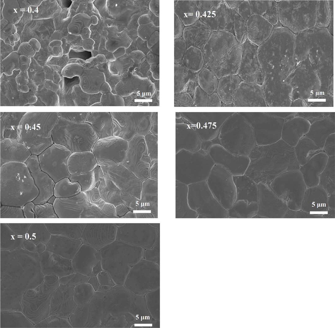 a clearer grain boundary, supporting the data in Figure 6, showing the bulk density of the (1-x)BZT–xBCT ceramics. For 0.525BZT–0.475BCT the