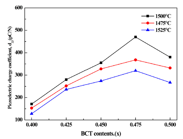 at 1500 °C showed a relatively higher piezoelectric charge constant, indicating that