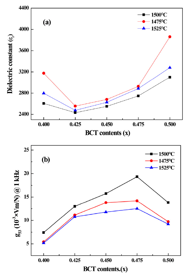 Figure 9(a) displays the dielectric constants of (1-x)BZT–xBCT at 1kHZ (1475 °C, 1500 °C, 1525