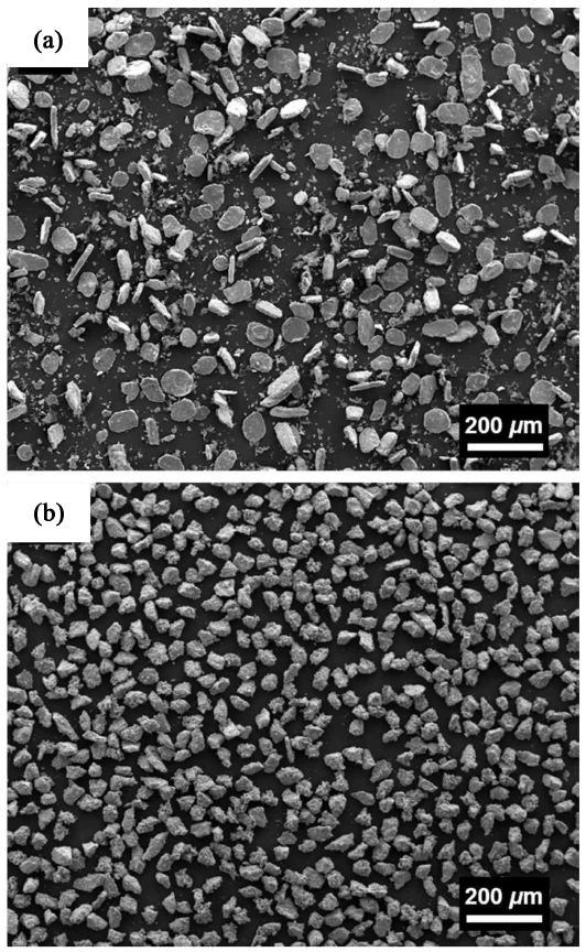SEM images of the BE-P and SCRAP-P are shown in Fig 2 displaying particle shape and size. The BE-P has a flat flake shape and an irregular
