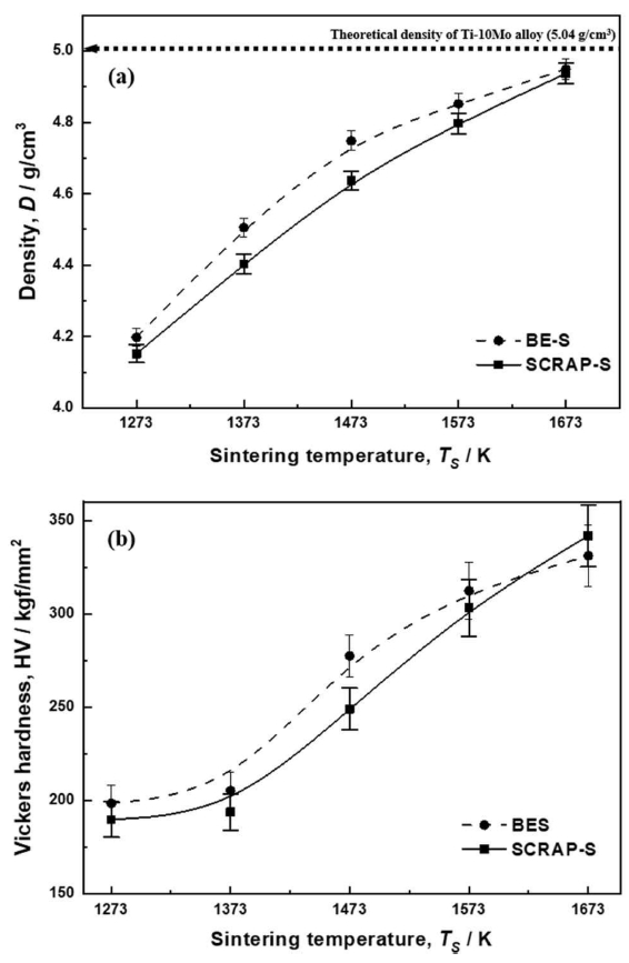 Figure 5 shows changes in the density (a) and Vickers hardness (b) of the BE-S and SCRAP-S