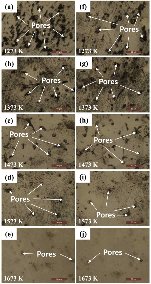 them diminished as temperature increased, and at 1673 K, they became almost identical.
