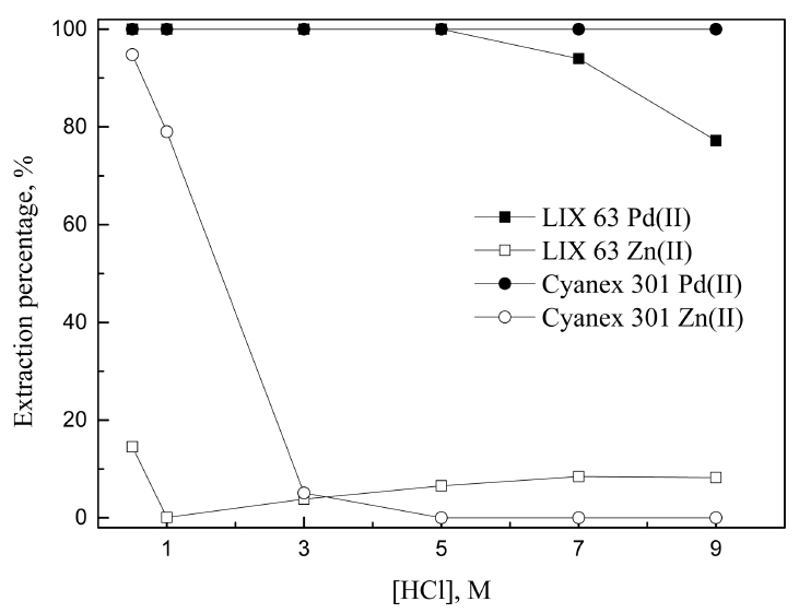 Effect of acid concentration on the extraction percentage of Pd(II) and Zn(II) from