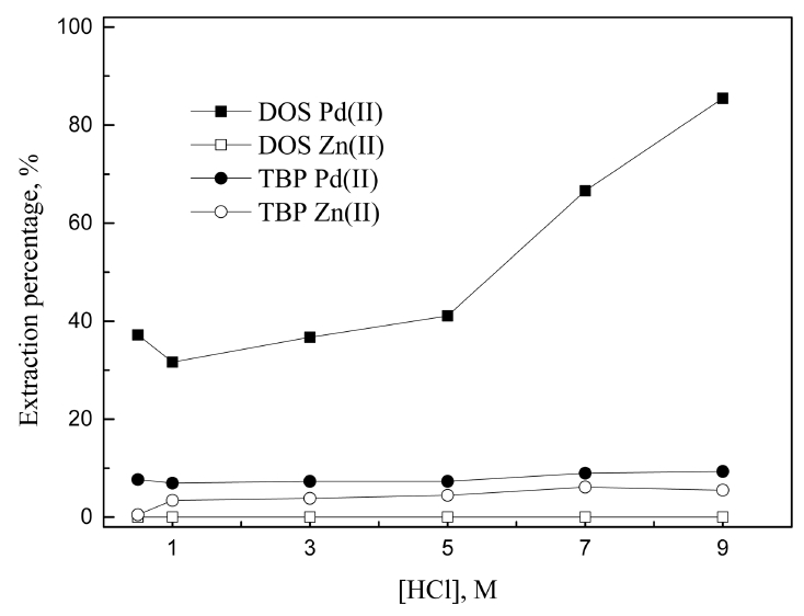 7 M hydrochloric acid solution. (Aqueous: [Pd2+] = 0.1 g/L, [Zn2+] = 0.5 g/L, [HCl] = 7 M; Organic: [DOS] = 0.01-0.2 M, A/O=1, Diluent: kerosene)