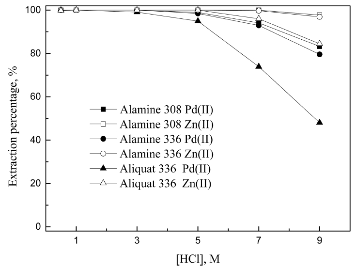 hydrochloric acid by cationic extractants. (Aqueous: [Pd2+] = 0.1 g/L, [Zn2+] = 0.5 g/L, [HCl] = 0.5-9 M; Organic: [Extractant] = 0.1 M, A/O=1, Diluent: kerosene)