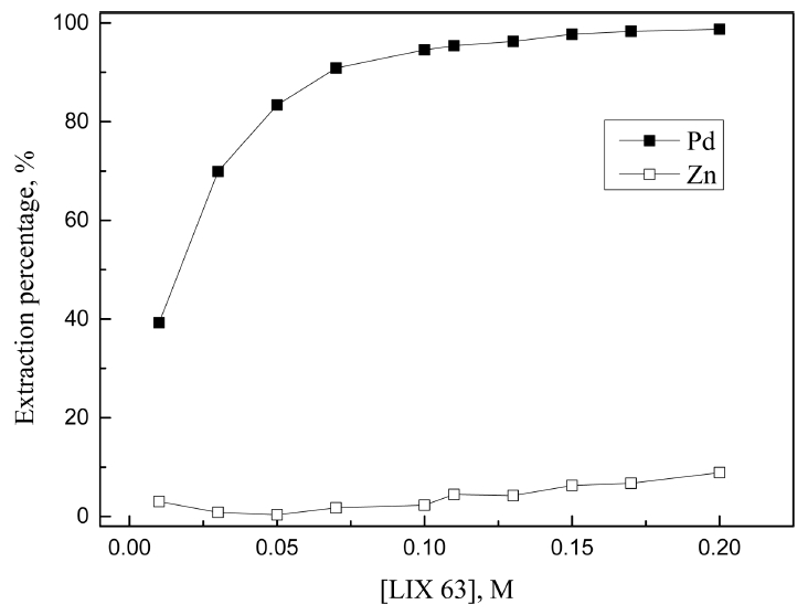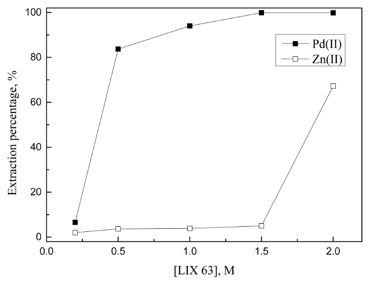 Effect of LIX 63 concentration on the extraction percentage of Pd(II) and Zn(II) from