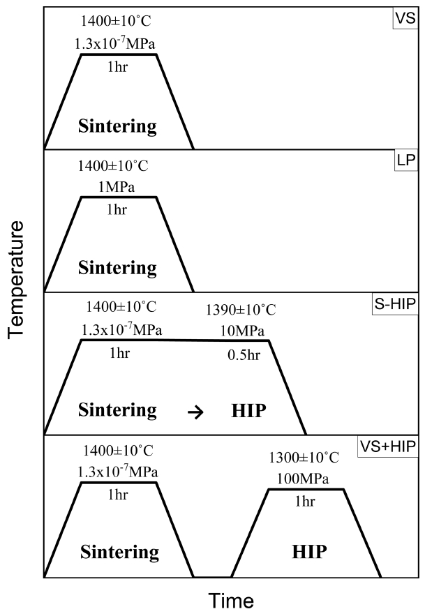 VS), 가압 소결(Low Pressure Sintering, LP), Sinter-HIP(S-HIP), 진공 소결 후 HIP처리(VS+HIP) 4