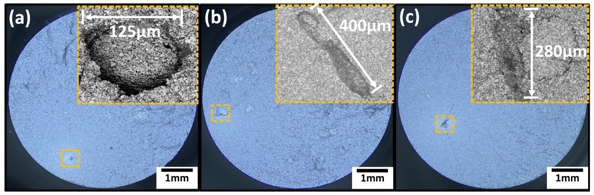 그림 10은 VS, LP 및 S-HIP 소결 피로 시험편의 마크로 파단면 및 파단 기점에서 나타난 기공 형상이다. 관찰된 기공의 형상은 개재물 혼입, 기공(pore)의