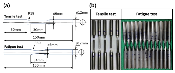 인장 시험과 피로 시험은 만능 인장 시험기(MTS, Landmark 100 kN)를 이용하였다. 인장 시험의 크로스헤드(cross-head) 진행속도는