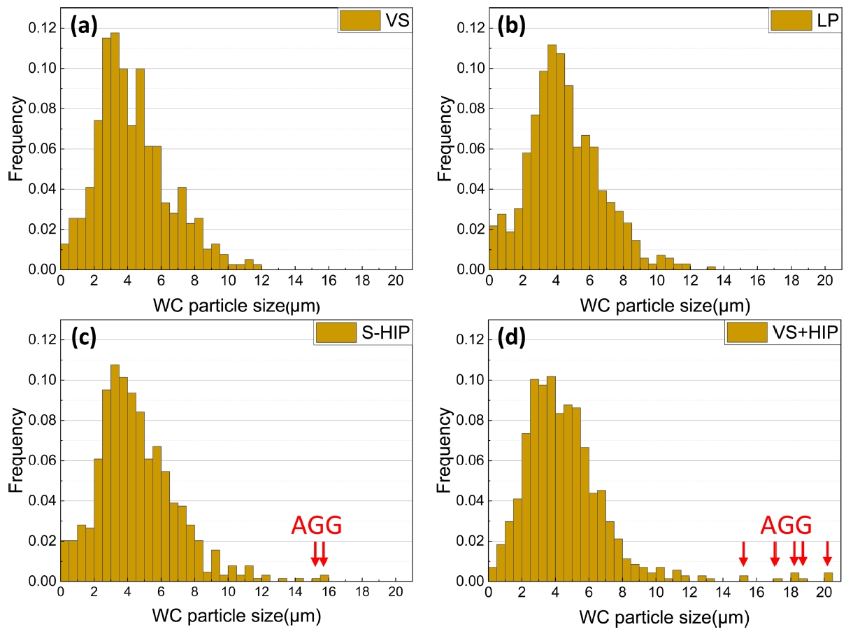 있다. HIP 공정을 추가한 S-HIP과 VS+HIP에서는 SEM 미세조직에서 관찰된 조대한 WC 입자의 분율이 높게 나타나고 있으며, 소결 후 HIP에