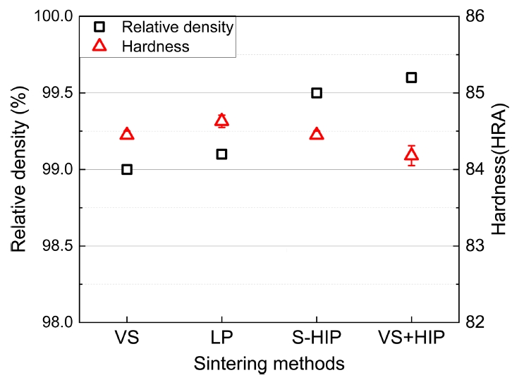입자 성장에 영향을 줄 수 있으므로 소결 후 HIP 조건을 10°C 감소시킨 온도에서 10 MPa 압력으로 진행하였다. VS+HIP은 1차 진공 소결한