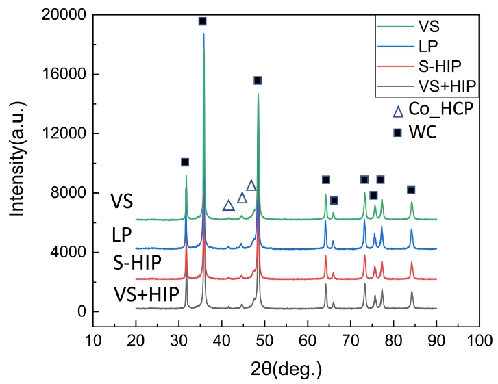 안정상인 Co_HCP 상으로 변태한 것을 알 수 있다. 또한 소결 이후 추가적인 고압 HIP 공정을 진행한 S-HIP과 VS+HIP도 HIP처리의