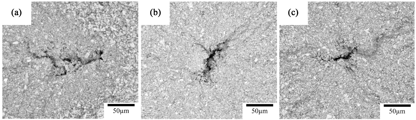 않았다. VS, LP 그리고 S-HIP에서 조기 파단이 일어난 시편의 파단면에 나타난 기공의 대표적인 사진을 그림 8에 나타냈으며, 기공은 모두 길고 가는 형상을 나타내고 있다. 고압이 적용된 S-HIP과 VS+HIP은 소결 과정에서 치밀화가 VS와 LP보다 더