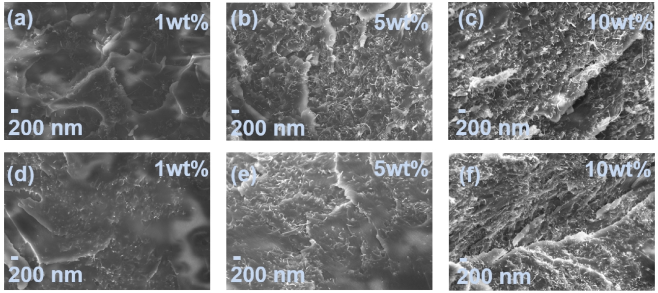 그림 2는 CNT/에폭시 복합체의 SEM 촬영 사진이다. (a), (b), (c)는 MWCNT/에폭시 복합체의 단면 사진이며 (d), (e), (f)는 carboxyl기가