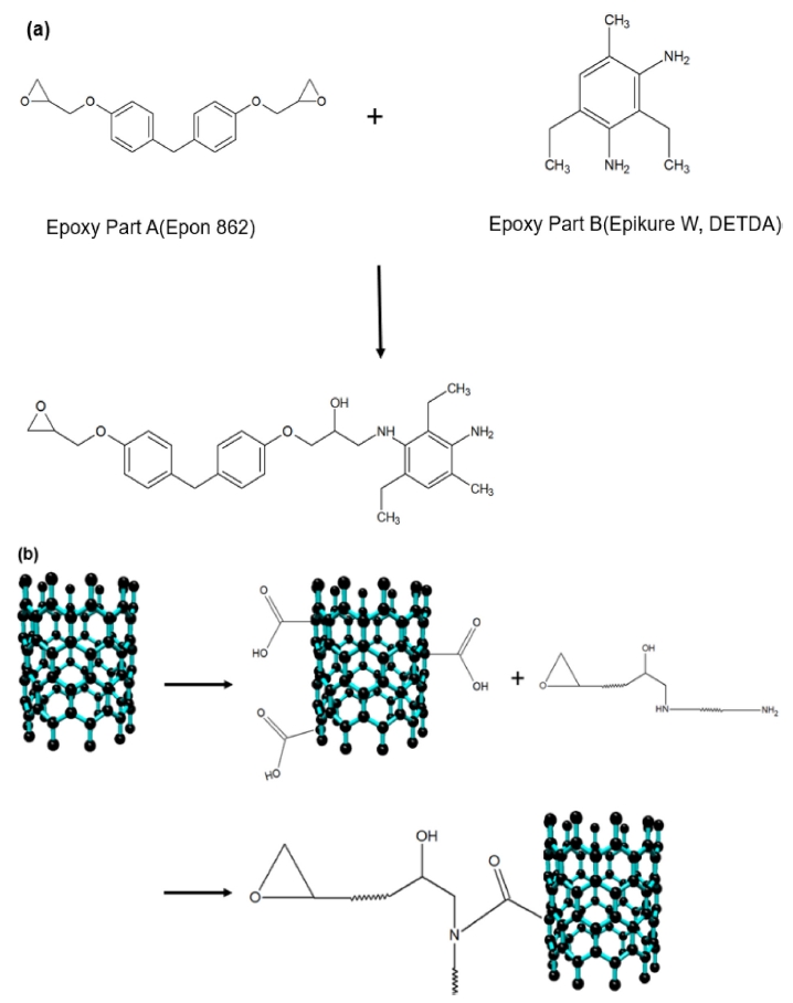 자체 버틸 수 있는 힘이 증가하게 되는 것이다 [25,26]. 이와 더불어 carboxyl기 기능기를 갖는 MWCNT와 매트릭스가 화학적으로 결합하게 되면 부하 전달과 함께 더욱 물리적으로 강화된다 [27,28]. 그림 4(a)는 매트릭스로 사용한 에폭시 Epon 862의 수지, 경화제가 화학적으로 결합함을 보여주는 도면이다. 그림 4(a)에서 결합한 에폭시가 그림 4(b)에서 carboxyl기 기능기를 갖는 MWCNT를 만나 다시한번 화학적 반응을 나타내는 개략도이다. 공유결합을 통한 결합은 물리적인 결합보다 훨씬