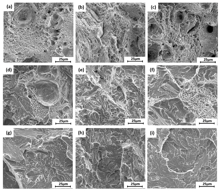 그림 11은 940 °C에서 퀜칭 후 610 °C에서 템퍼링 열처리한 각 합금의 상온 인장시험, 상온 충격시험 및 저온 충격시험편의 파단 후 파단면 SEM