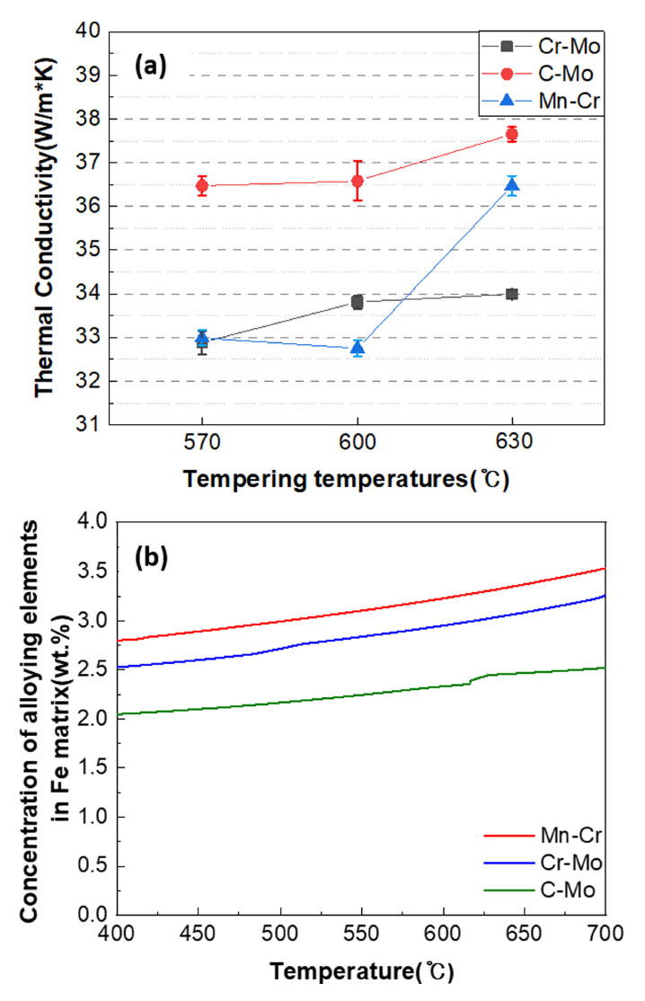 변화와 Fe 기지내 고용되어 있는 합금원소의 농도를 열역학으로 계산한 결과이다. 그림 12(a)에서 각 합금은 모두 템퍼링 온도가 높아짐에 따라 합금의 미세조직은 템퍼링에 의해 탄화물이 석출되면서 기지조직인 페라이트의 열전도도는 높아지고 있다[36]. Cr-Mo 합금은 570 °C에서 600 °C로 증가하면서 열전도도가 높아지고 있으나, 630 °C까지는 큰 변화가 없었다. 그러나 Mn-Cr