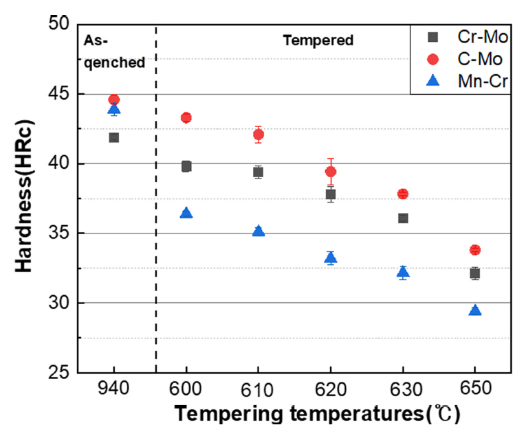 높은 Cr-Mo 합금과 C-Mo 합금은 템퍼링에 따른 템퍼 연화 저항이 높아 600 °C 템퍼링 조건에서 로크웰 경도 1.3~2.1HRc의 낮은 경도