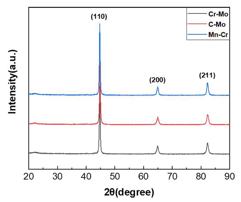 그림 3은 각 합금을 940 °C에서 1시간 유지후 퀜칭하고, 610 °C에서 2시간 템퍼링한 합금 3종의 표면에 대한 XRD 회절패턴을 나타낸 것이다.