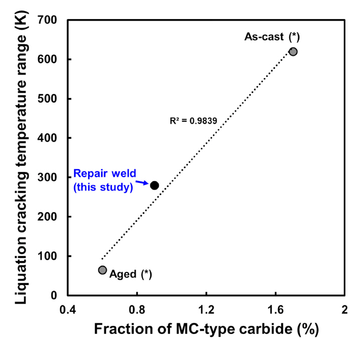 Relationship between fraction of MC-type carbide and liquation cracking temperature