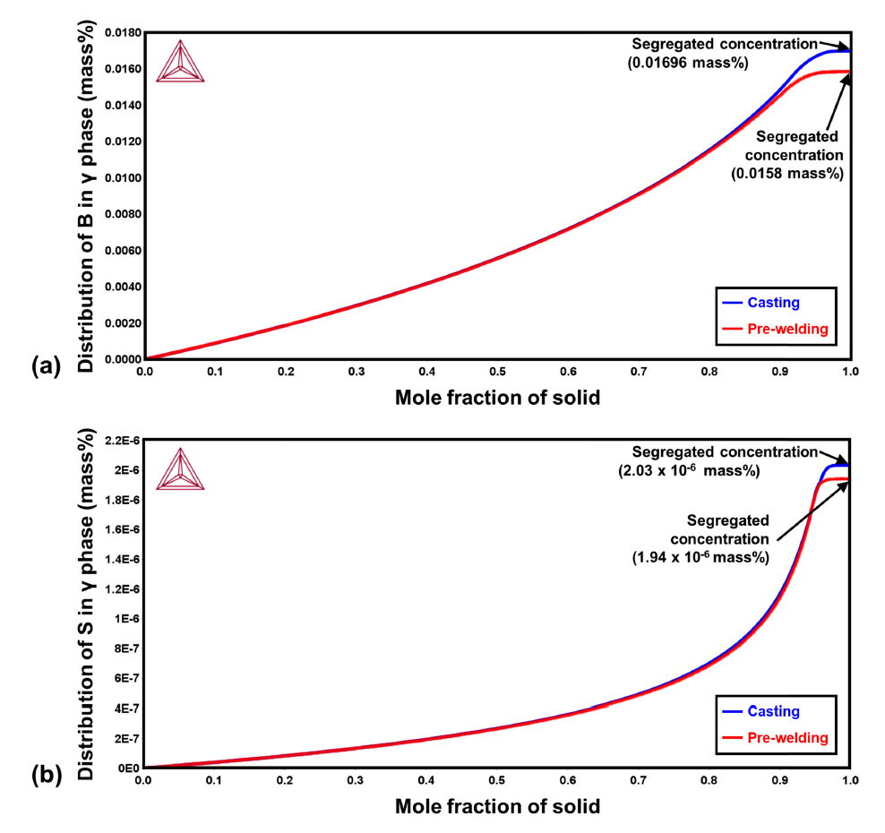 Calculated solidification segregation behavior of (a) B and (b) S for the conditions