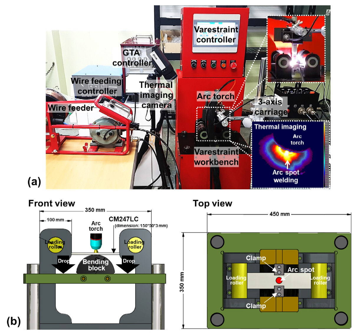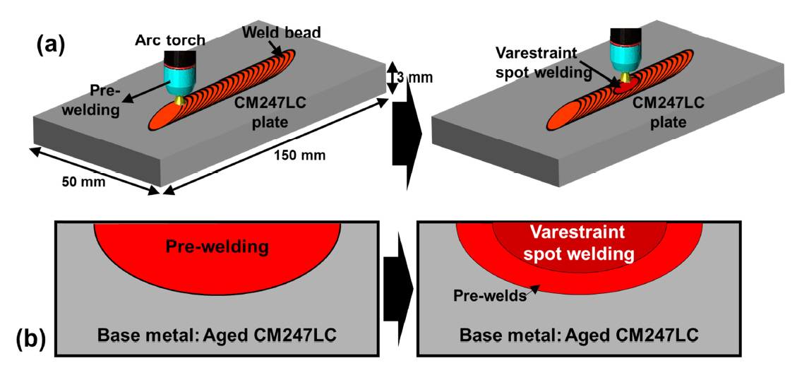 ๋น๋ ์ค์๋ถ์ ์ํฌ ์ ์ฉ์ (arc spot welding)์ ์ด์ฉํ Varestraint ์ํ์ ์ค์ํ์๋ค. ์ํ๊ณผ์ ์์ pre-welding์