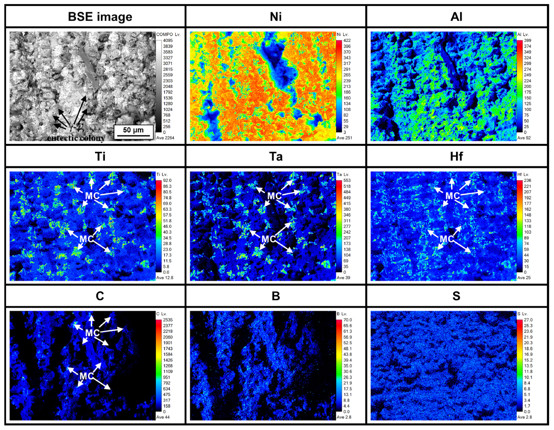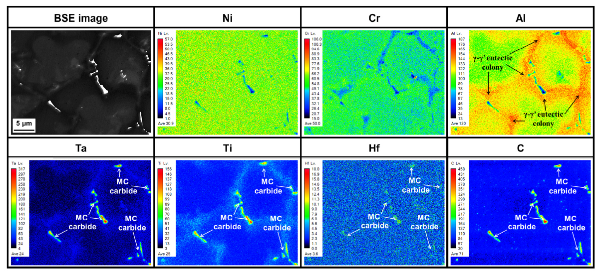2์ฐจ ์กฐ์ง๋ค์ MC ํ ํํ๋ฌผ ๋ฐ ฮณ/ฮณ' ๊ณต์ ์กฐ์ง์ธ ๊ฒ์ผ๋ก ์ ์๋ ค์ ธ ์์ผ๋ฉฐ[3,9,11], ์ด๋ฌํ ํน์ง์ ์ฉ์ ๊ธ์์์๋ ์ ํ์ธ๋๋ค. ๊ทธ๋ฆผ 5๋ ๊ทธ๋ฆผ 4 โAโ ์์ญ์ ๋ํ EPMA ๋ถ์๊ฒฐ๊ณผ๋ฅผ ๋ํ๋ธ๋ค. ์ฉ์ ์๊ณ ์, MC ํํ๋ฌผ(M=Ti,Ta,Hf ๋ฑ) ๋ฐ ฮณ'์ํ์ฑ์์ (Al)์ ๋ฏธ์ธํธ์(microsegregation)