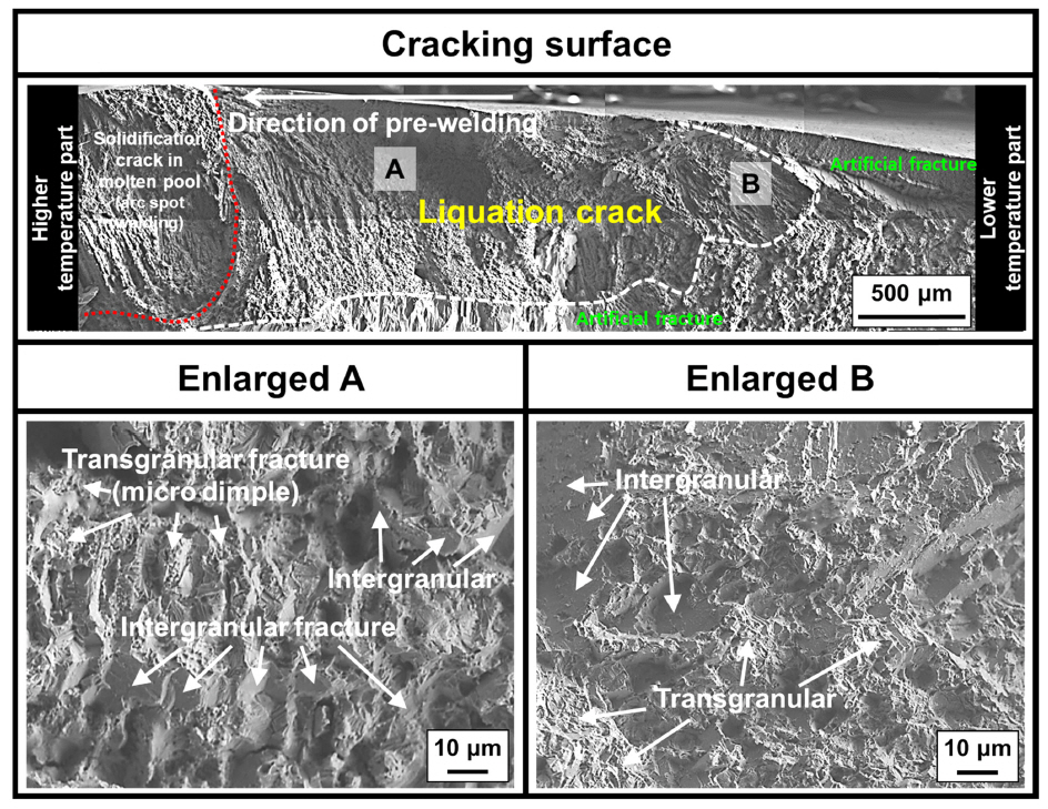 ๋ฐ โBโ ์์ญ), ํ์ฑ ์์น์ ๋ฐ๋ผ ์ฉ์ต์ง ๊ฒฝ๊ณ์ (fusion line) ๋ด์ ๊ท ์ด๊ณผ ์ด์ํฅ๋ถ ๊ท ์ด๋ก ๊ตฌ๋ถ ๊ฐ๋ฅํ๋ค. ๊ทธ๋ฆผ 7์ ๊ทธ๋ฆผ 6์ ๊ณ ์จ๊ท ์ด ํ๋ฉด๊ด์ฐฐ ๊ฒฐ๊ณผ๋ฅผ ๋ํ๋ธ๋ค. Varestraint ์ํ ์์ ์ฉ์ต์ง ๊ฒฝ๊ณ์ ๋ด๋ถ์ ํ์ฑ๋ ๊ท ์ด์ ์๊ณ ๊ท ์ด๋ก ํ๋ณ๋์๊ณ , ์ด์ํฅ๋ถ์ ํ์ฑ๋