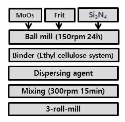 이러한 조건대로 배합비율을 정하고 그림 1과 같은 공정 방법으로 제조하였다. 보호막층은 질화규소 파우더와 MoO3 파우더 그리고 글라스 프릿을 ball-mill로 혼합하고 페이스트의 점도를 맞추기 위하여 ethyl cellulose계 바인더를 40 wt% 혼합한
