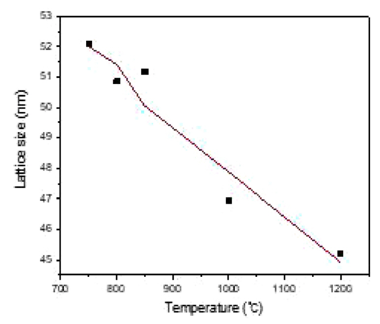 그림 9, 그림 10은 Frit : Si3N4를 8 : 2기준으로 MoO3 파우더가 10 wt%첨가된 페이스트의 소성온도에 따른 결정 크기와 격자변형의 추세선으로 낮은 온도의 750 °C에서 가장 큰 결정 크기인 52.10