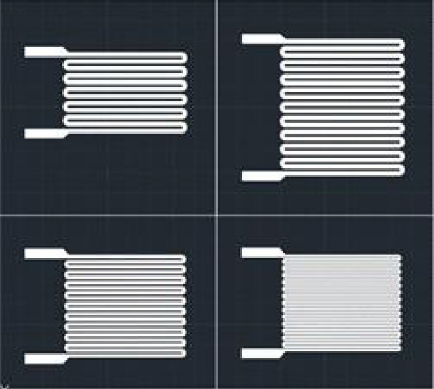 히터 소자 전극의 패턴은 그림 2와 같은 형태로 전극의 폭과 두께를 변화하여 설계하였다. 표 4는 전극두께와 폭의 설계조건으로 전극 사이의 폭은 200 μm, 300 μm와 400 μm로 정하고 각각의 전극두께는 200 μm, 300 μm,