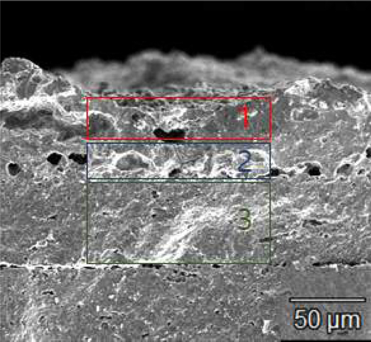 Si가 가장 높게 검출 되었고 높은 비율의 글라스 프릿으로 사이알론이 다른 층에 비해 많이 석출되었다. 또한 Ag가 전극층으로 부터 확산되었다.