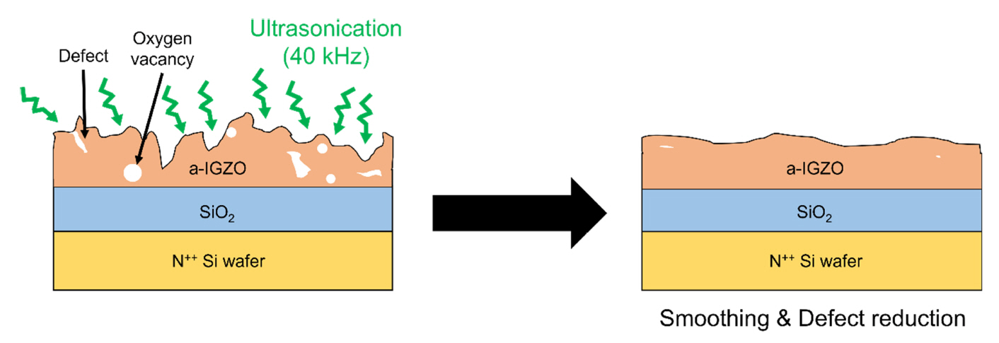 등은 물리적 한계가 있으며, 공정 단계도 많아지게 된다[11,14,16,17]. 이를 극복하기 위해서, a-IGZO 활성층 표면에 대한 plasma, thermal, 그리고 초음파 처리에 대한 연구가 진행되고 있다[18-22]. 그 중, 초음파 기술은 나노 크기 물질의 가공 목적을 위해 반드시 필요하며, cavitation 현상을 이용하여 강력한 입자 제거 능력과 다방면