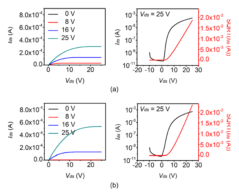 characteristic curve를 보여준다. Output characteristic curve는 Vds 를 0~25 V까지 0.5 step voltage를 인가하며 Ids 값을 측정하였으며, gate bias voltage는 각각 0, 8, 16, 25 V 인가하였다. Transfer characteristic curve