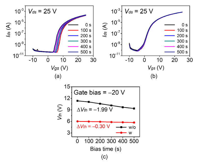경우 bias voltage가 500초 이상 인가되어도 Vth 값은 -0.30 V 이동하였다. 전압이 인가되는 시간에 따른 두 소자의 Vth 값의 변화량은 그림 7(c)에 정리하였다.