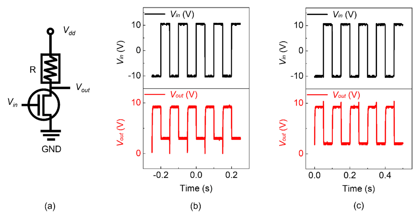 파워 서플라이와 오실로스코프, 함수발생기를 사용하여 회로를 구성하였으며, 회로의 부하 저항을 1 MΩ, drain 공급 전압 (Vdd)에 10 V를 인가하여 10 Hz에서 dynamic response characteristic을 측정하였다. Vin 이 0 V 일 때, 인가되는 전압이 Vth 값보다 낮아 gatedrain-source간 open된 무한대의 저항을 띄기 때문에 Vout 으로 10 V가 출력되게 된다. 반대로 Vin 에 10 V가 인가될때, gate-drain-source간 short된 형태의 극소의 저항을 띄며, current들이 ground로 흘러 Vout 은 0 V가 출력된다. 그림 8(b)는 초음파 표면처리를 진행하지 않은 a-IGZO TFT 소자의 dynamic response characteristic curve이며, 그림 8(c)는 20분간 초음파 표면처리를 진행한 a-IGZO TFT 소자의 curve이다. 두 소자 모두 저주파 영역에서 입력되는 구형파 low/high 신호를