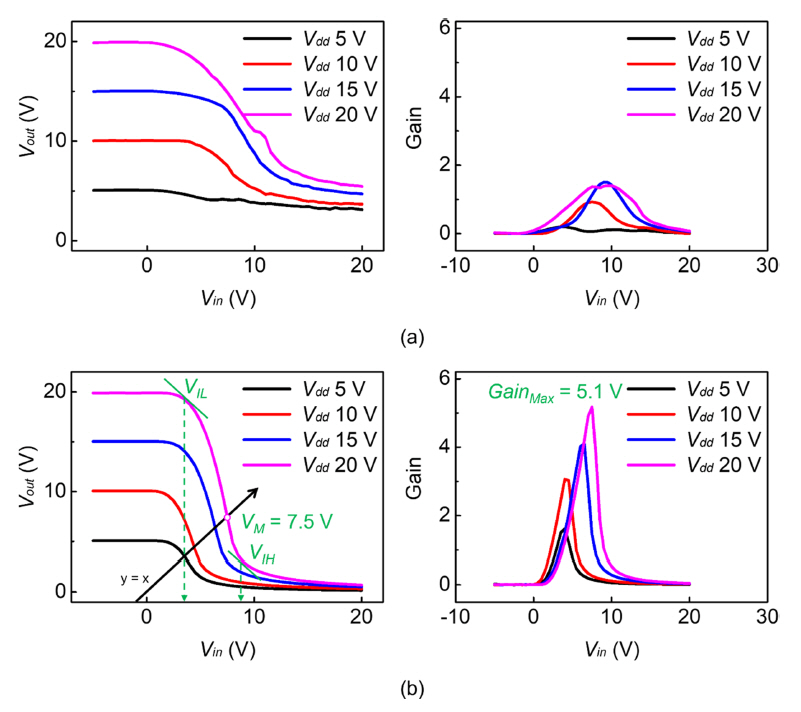transfer characteristic (VTC) curve 를 측정하였으며, 그 결과를 그림 9에 나타내었다. VTC curve는 5, 10, 15, 20 V로 달리 인가되는 Vdd 에 따른 Vin -Vout curve이며, 그를 통해 추출한 gain 값을 오른쪽 그림에서 볼 수 있다. 초음파 표면처리가 수행되지 않은 소자인 그림 9(a)의 경우, 인가되는 전압에 따른 출력 전압과 그에 따른 gain 값이 매우 불안정한 형태로 나타났다. 초음파 표면처리를 진행한 그림 9(b)의 경우, 입력 전압에 대한 출력 전압이 안정적인 형태를 띄었으며, Vdd 에 20 V가 인가되었을 때, VM = 7.5 V에서 5.1의 gain 값을 보였다. 구성한 inverter 회로의 noise margin 특성 분석 결과, Vdd = 20 V 일 때, input high voltage (VIH)= 8.7 V, input low voltage (VIL) = 3.7V 가 추출되었으며, 추출된 VIH 와 VIH 를 이용하여 total noise margin 계산 결과 약 71.5 %가 나왔다. 이 결과를 통해, 초음파 표면처리 이후 IGZO TFT의 반전