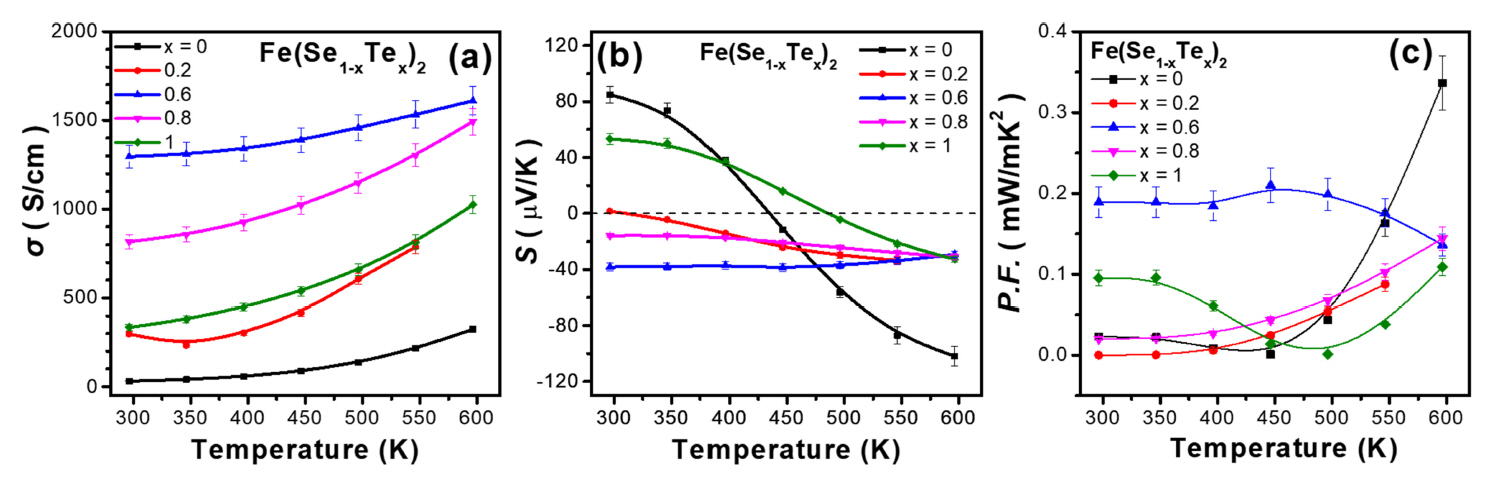 (a) Electrical conductivity σ, (b) Seebeck coefficient S and (c) power factor P. F. as a funtion of temperature for the Fe(Se1-xTex)2 (x = 0, 0.2, 0.6, 0.8 and 1).
