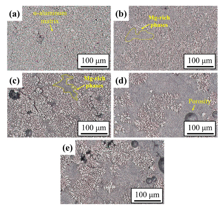 Weld nugget microstructure at low magnification (yellow line: Mg-rich phases cluster).