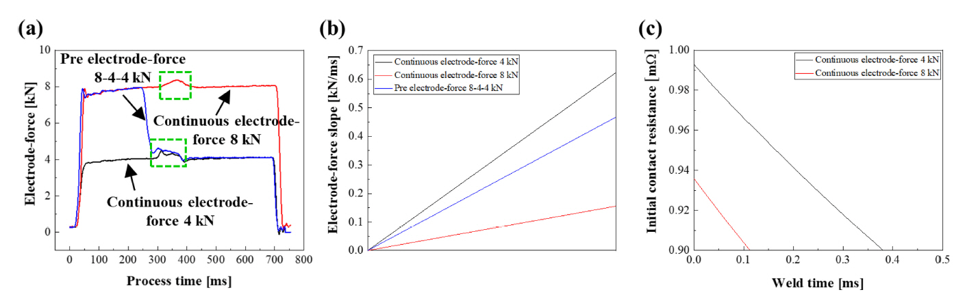 Contact resistance distribution by electrode-force control types during welding time: