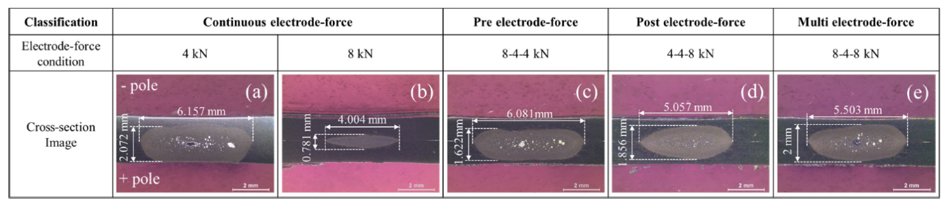 관찰된다. 이는 실험에 사용된 서보 모터로 가압력을 제어하는 방식은 너겟이 용융·팽창됨에 따라 가압력 보상 알고리즘에 의해 설정한 가압력보다 높은
