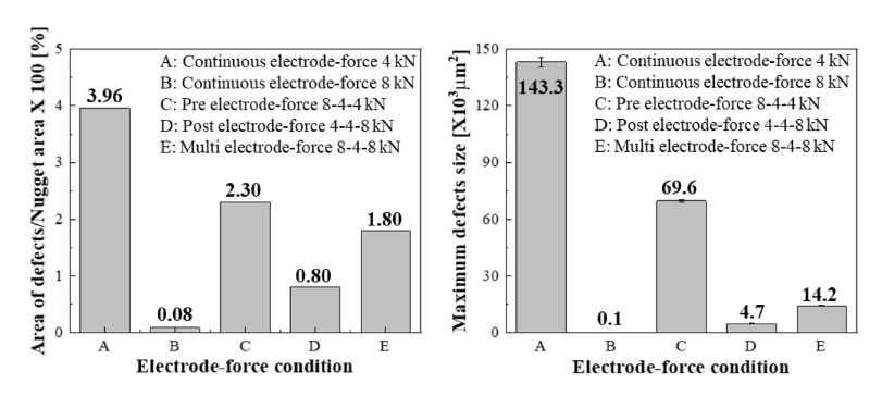 미흡할 것으로 판단된다. 일부 저자들은 알루미늄 합금의 저항 점 용접 시 유지시간 동안의 높은 가압력을 가할 경우 너겟의 내부 결함이 감소한다고 보고하였으나,