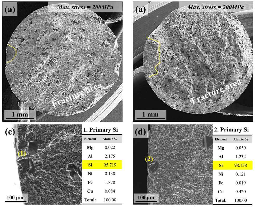 이에 따라 primary Si 상 내부에 파괴가 나타난 것으로 예상된다. 그러나 SEM 관찰 결과에서 미세한 30~40 μm 크기의 primary