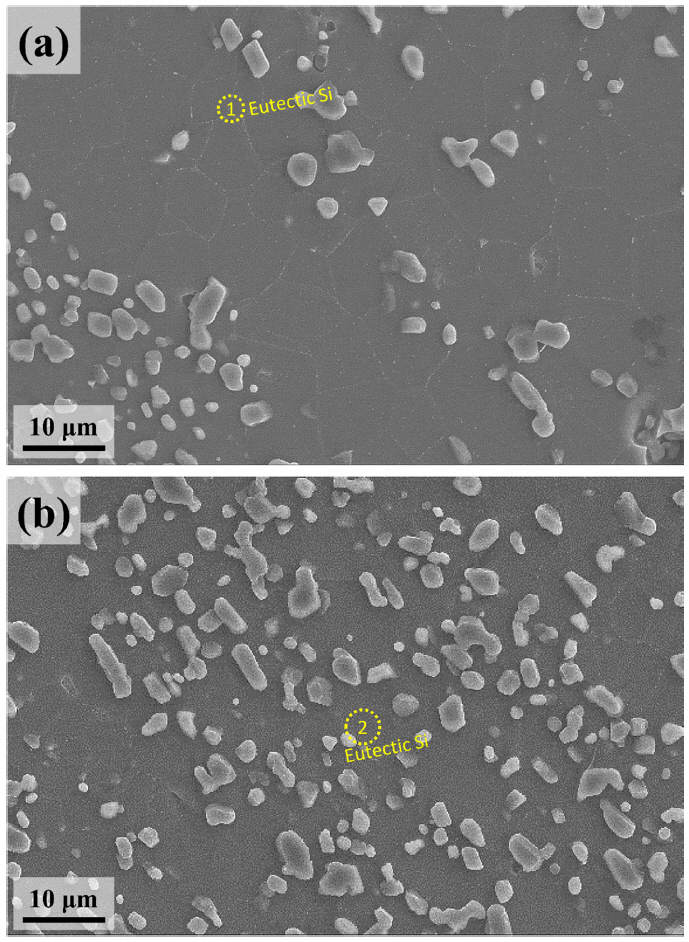 두 압출재들의 공정 Si 상들을 관찰하기 위해 고배율 SEM을 사용하였으며, 그 결과를 그림 4에 도시하였다. 생성된 공정 Si의 크기는 평균 3.78 μm(DC 압출 소재)와 평균 3.10 μm(EMS 압출 소재)로 확인되었다. 즉 EMS