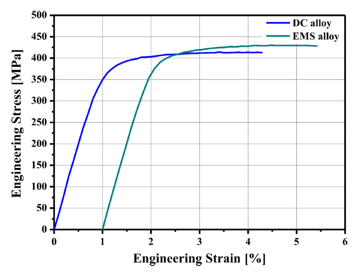 Stress-strain curves of extruded hypereutectic Al-Si alloys (DC & EMS alloy).